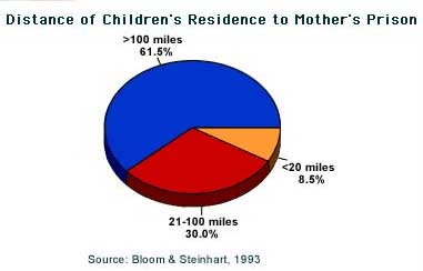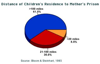 What About the Children? Extended families usually assume childcare responsibilities, though many states do not recognize family relations as legitimate foster care, and deny them financial support and social services [4]. Ten percent of children with mothers in prison are sent to foster homes, while the majority of children live with grandparents [5]. The Adoption and Safe Families Act of 1997 will doubtless send even more children into foster care in the future, as it allows courts to terminate parental rights if a child is in foster care for 15 months out of any 22-month period. Three characteristics distinguish children of incarcerated parents from their peers: 1. inadequate quality of care, mainly due to poverty; 2. lack of family support; and 3. enduring childhood trauma [6]. Studies show that kids with incarcerated mothers are more likely to wet their beds, do poorly in school and refuse to eat [7]. Children with mothers in prison often experience financial hardship, the shame and social stigma that prison carries, loss of emotional support and fear for their mother's safety [8] . The effect on society is equally chilling: children with imprisoned parents are at increased risk for poor academic treatment, truancy, dropping out of school, gang involvement, early pregnancy, drug abuse and delinquency [9]. These at-risk youngsters are most often overlooked by mainstream children's advocates. Unfortunately, prisons are most often located in remote rural areas and are inaccessible to families without cars. Also, because there are fewer prison facilities for women, an incarcerated woman is usually much further away from her home and is therefore much harder to visit [10], making the separation even more agonizing for both parent and child. Too little